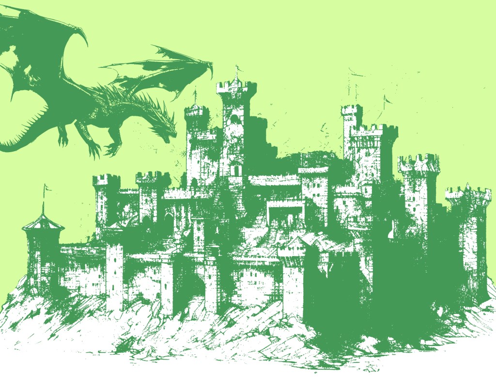 ↑ I built a castle! Well, illustrated one at least. Simple shading and lack of detail capture the early D&D vibes. Needs danger though…